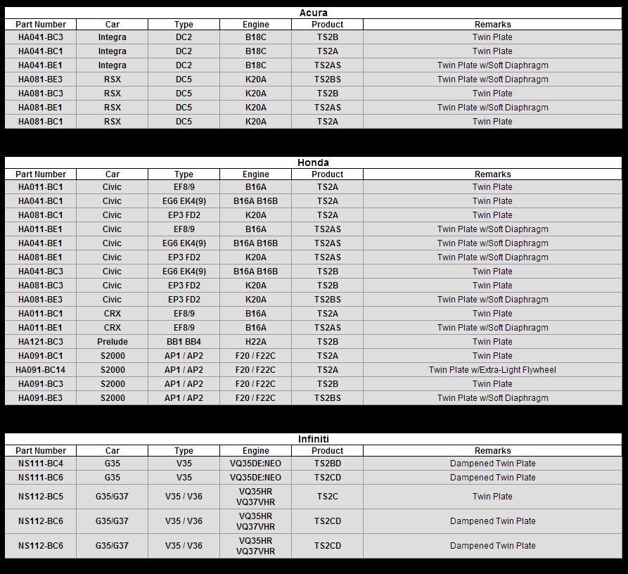 The TS Clutch line-up is for vehicles with moderate increases in engine power which will be used for daily street driving as well as frequent racing. The stamped steel cover maintains a reduced pedal effort, while the heat-treated alloy clutch discs improve durability and maximize performance.